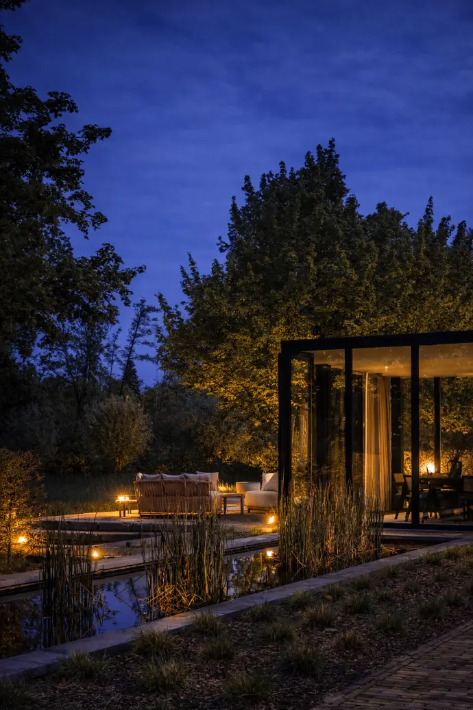 Wanneer de avond valt, komt de architectuur tot leven dankzij zorgvuldig geïntegreerde verlichting die zowel binnen als buiten een warme en exclusieve sfeer creëert.