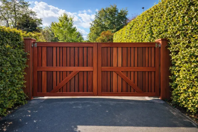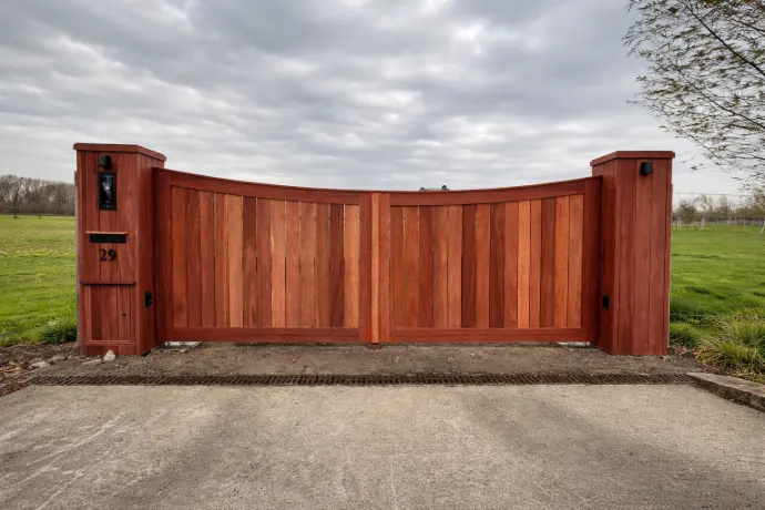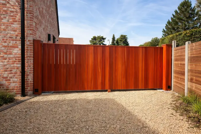 Voor deze residentiële woningen realiseerde Casalingo+ de volledige automatisatie van een hoogwaardige houten draaipoort, vervaardigd door De Sutter Naturally.